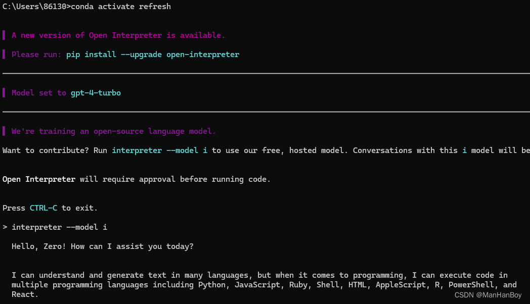 在cmd中对应环境中输入interpreter指令,即可实现功能激活。