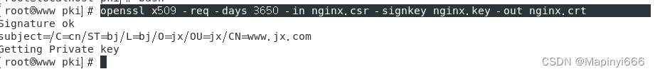 openssl x509 -req -days 3650 -in nginx.csr -signkey ./private/nginx.key -out nginx.crt