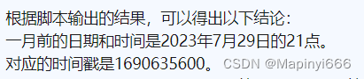 这段脚本的目的是获取一月前的日期和时间,并将其转换成时间戳格式。然后,获取当月的第一天的日期和昨天的日期。