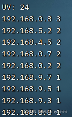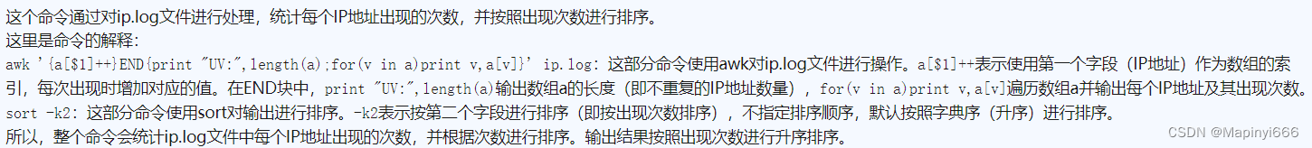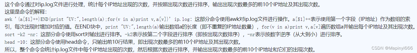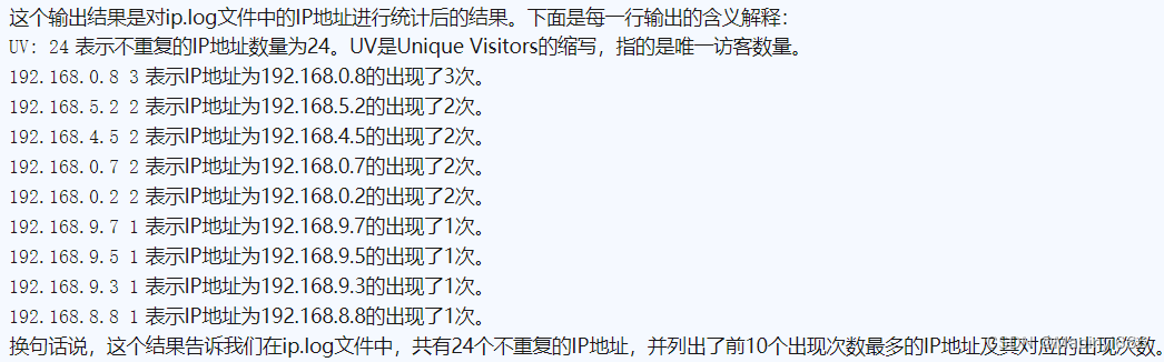 awk '{a[$1]++}END{print "UV:",length(a);for(v in a)print v,a[v]}' ip.log |sort -k2 -nr |head -10