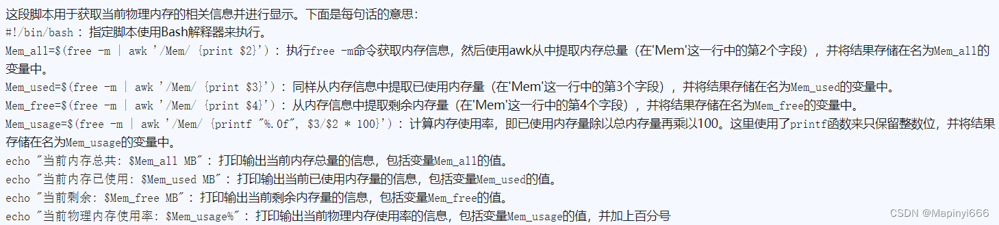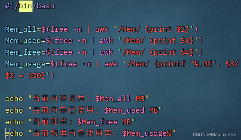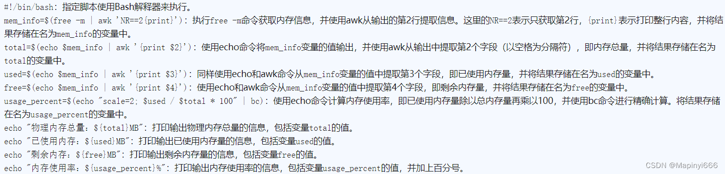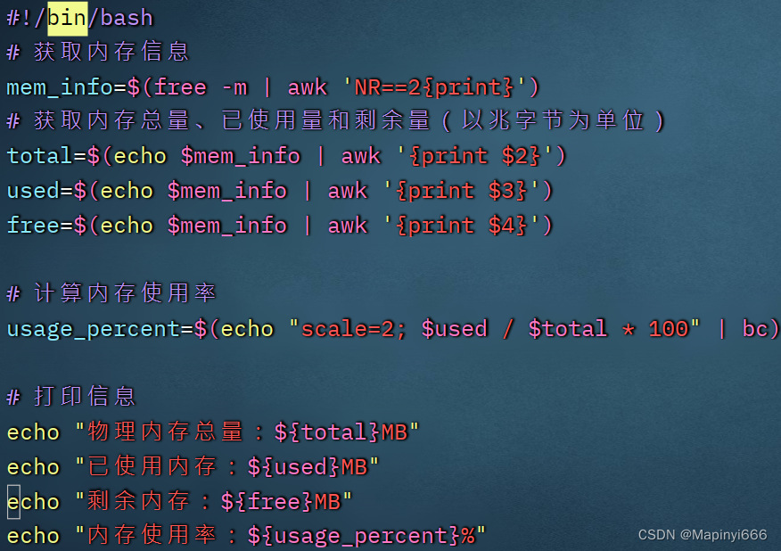 mem=$(free -m | grep "Mem" | awk '{ printf "%.0f", $3/$2 * 100 }'):使用free命令获取内存信息,再使用awk命令计算内存使用率百分比。 -
