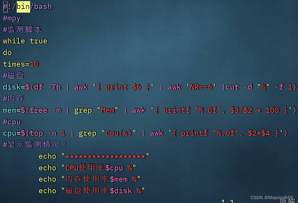 这是一个监测脚本,用于监测系统的磁盘、内存和CPU使用率。下面是对脚本中各部分的解析: