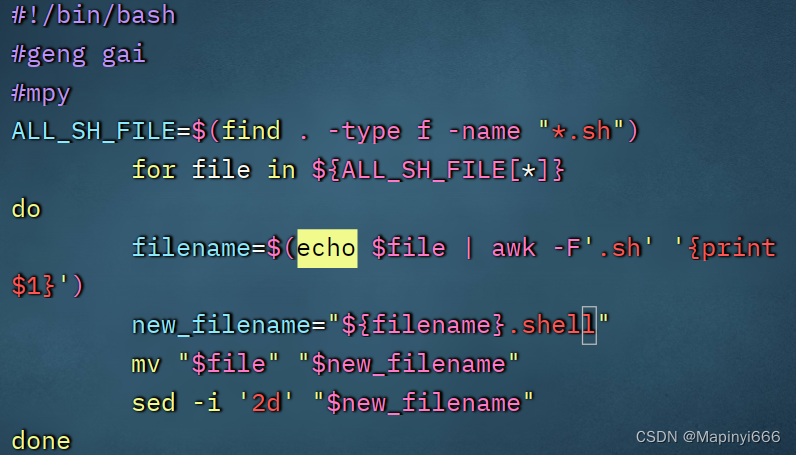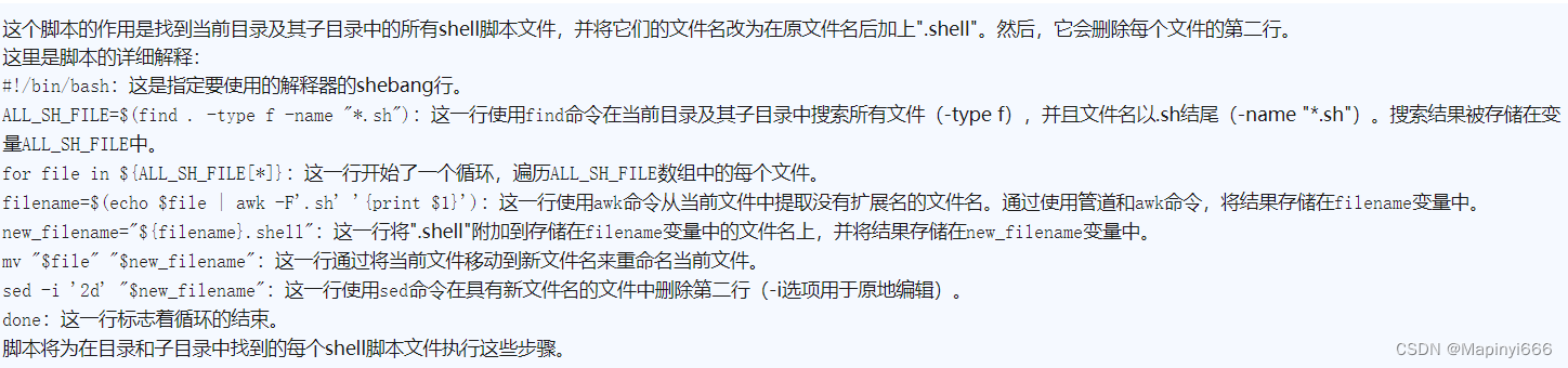 五、把当前目录(包含子目录)下所有后缀为 ".sh" 的文件后缀变更为 ".shell",之后删除每个文件的第二行。