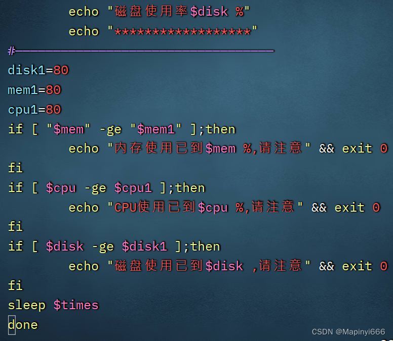 echo "磁盘使用率$disk %":打印磁盘使用率。 -