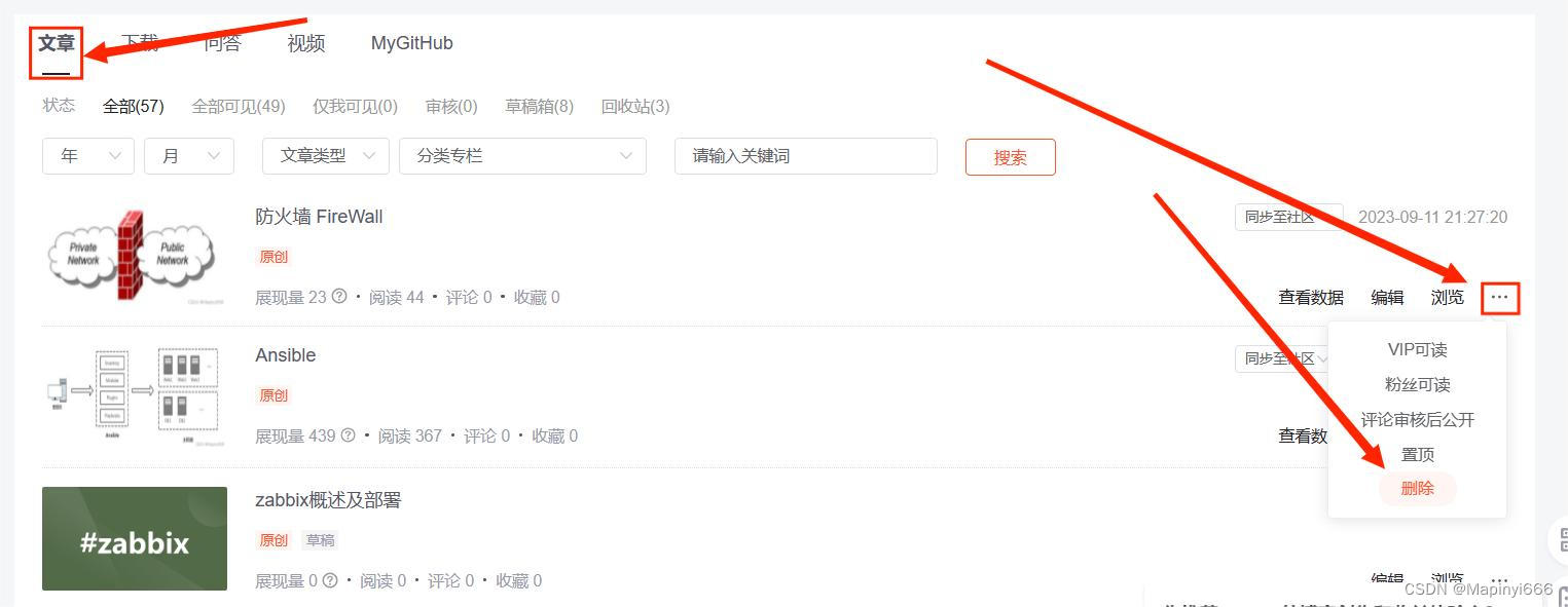 点击内容管理进入下方界面,选择文章,在想要删除的文章的后边的浏览旁边有三个点,点击后选择删除,删除后回到主页面刷新页面,会发现已发布的文章已经成功的被删除