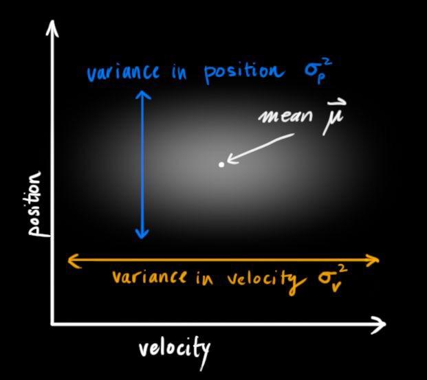 我们并不知道实际的位置和速度,他们之间有很多种可能正确的组合,但其中一些组合的可能性要大于其他组合。如下图(图1).