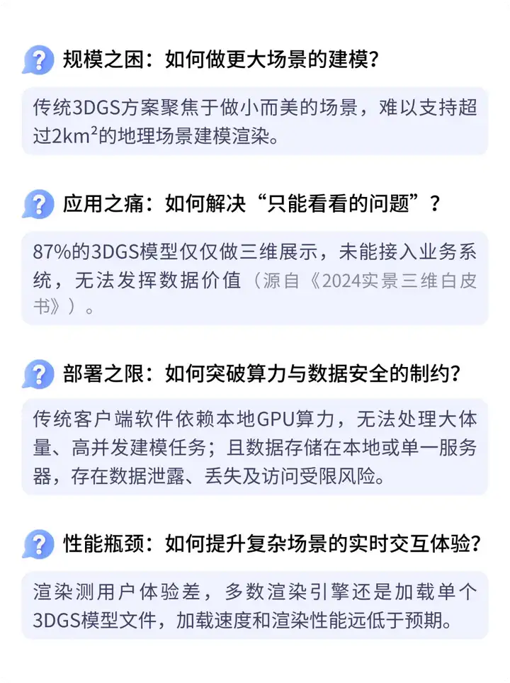 早在今年3月份,Mapmost团队发布了一款小巧易用的客户端3DGS建模软件,用户可以在自己的电脑上安装,快速将自己手上的照片转为3DGS模型。自推出以来,我们陆续接到了不同行业的用户反馈,这些来自测绘、规划、电力、交通、文旅等领域的工程师,在深度试用后给我们提出了不少宝贵意见:
