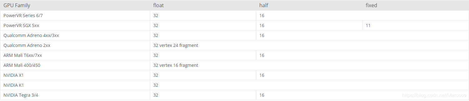 及时在移动GPU上,不同的GPU家族也有不同的精度支持.治理是一个概述,每个移动GPU家族如何对待每个浮点类型(由他们使用的bit数表示)