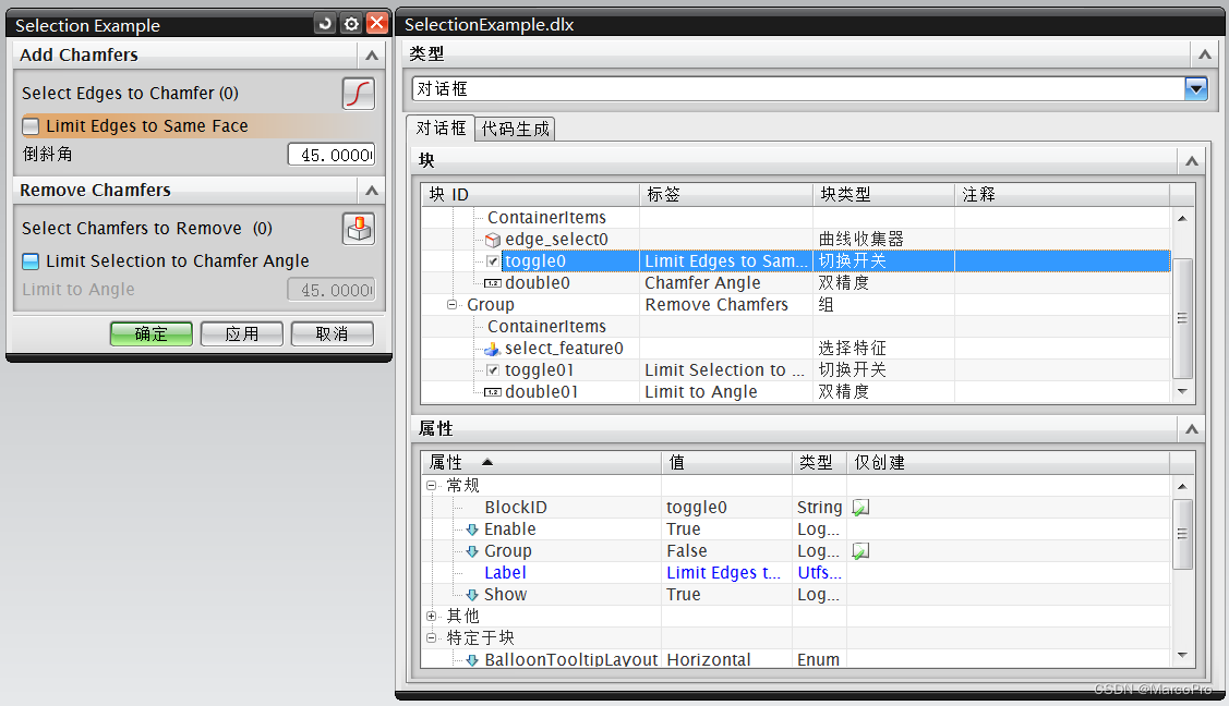 本实例主要用到的控件如下:曲线收集器、切换开关、选择特征、双精度