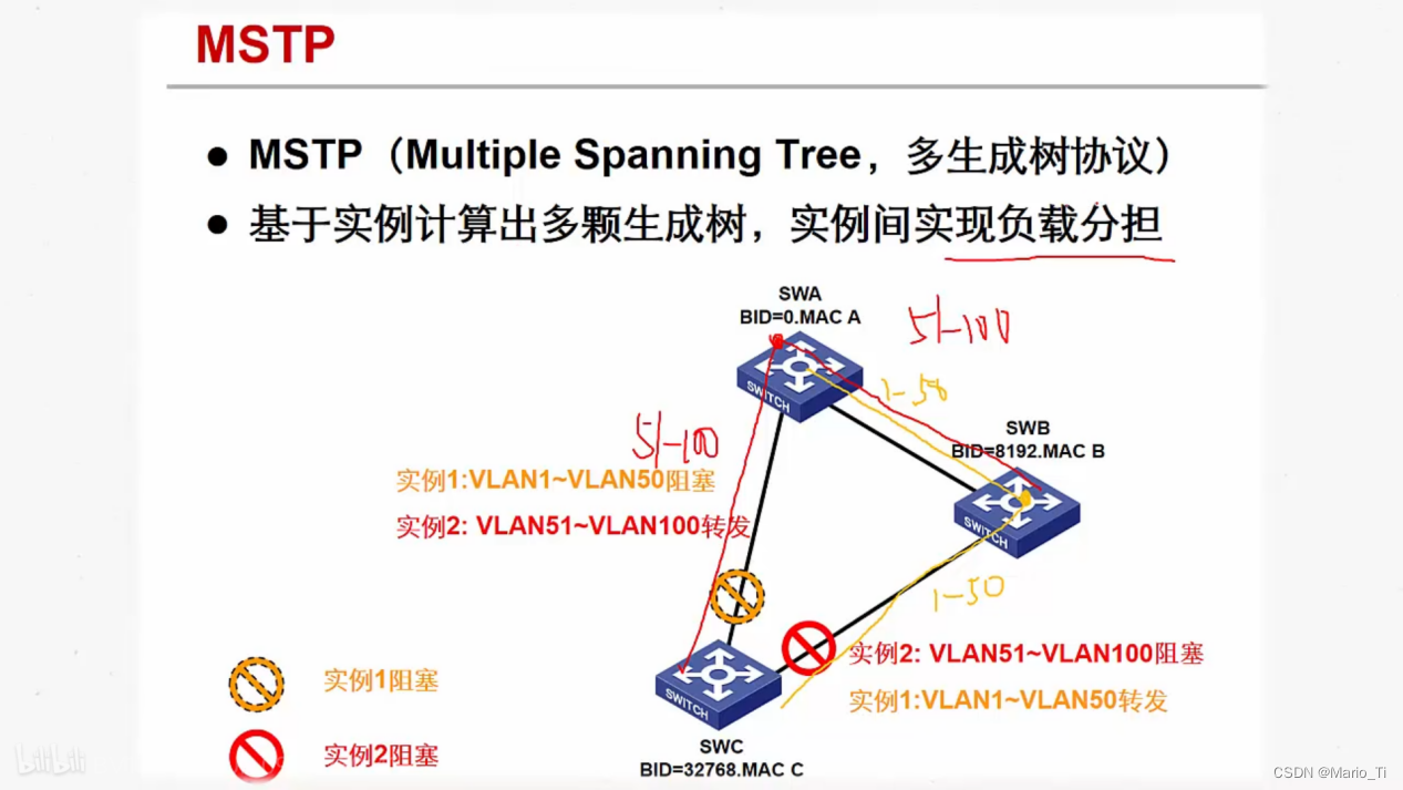 通过MSTP把一个交换网络划分成多个域,每个域内形成多棵生成树,生成树之间彼此独立。每个域叫做一个MST域,每棵生成树叫做一个多生成树实例 MSTI。