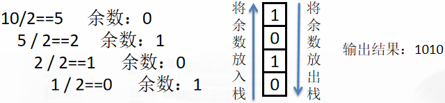 (1)主要原理:如何实现十进制转二进制?要把十进制转化成二进制,可以将该十进制数字和2整除(二进制是满二进一),直到结果是0为止。将每一步的余数进栈,最后将栈中的内容其输出,输出的结果就是该十进制数对应的二进制数了。比如将一个十进制数 10,转化成对应的二进制数,其过程大概如下所示:
