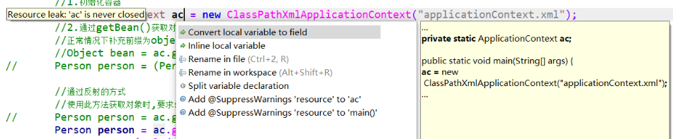 注:在初始化容器时会产生提示 ac对象没有关闭资源