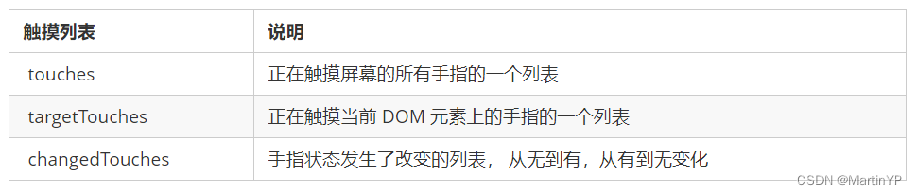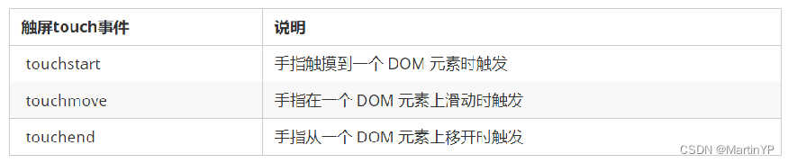 touch 对象代表一个触摸点。触摸点可能是一根手指,也可能是一根触摸笔。触屏事件可响应用户手指(或触控笔)对屏幕或者触控板操作。 常见的触屏事件如下: