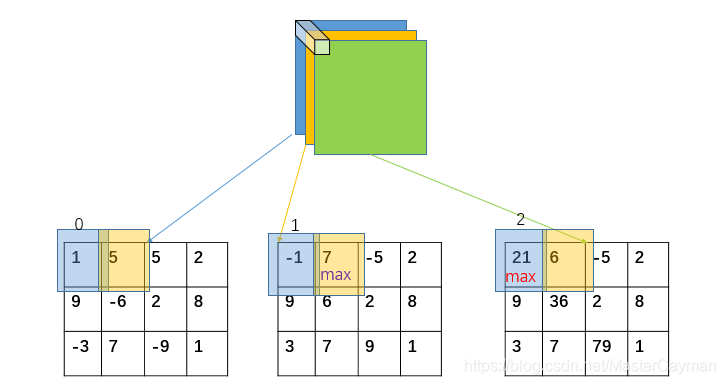 axis=1,得到第一组[1, 5, 5, 2], [9, -6, 2, 8], [-3, 7, -9, 1];第二组[-1, 7, -5, 2], [9, 6, 2, 8], [3, 7, 9, 1];第三组[21, 6, -5, 2], [9, 36, 2, 8], [3, 7, 79, 1]。逐个元素取最大索引,首先是第一组: