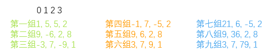 [1, 5, 5, 2] [9, 6, 2, 8] [3, 7, 9, 1] , 然后再依次取三个列表中对应元素,如下: