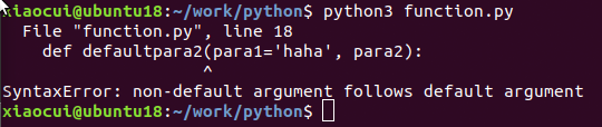 此时调用defaultpara2时,会报错,提示默认参数后面有一个非默认参数,Python中规定默认参数后面不能跟非默认参数,具体原因见知乎https://www.zhihu.com/question/24981697