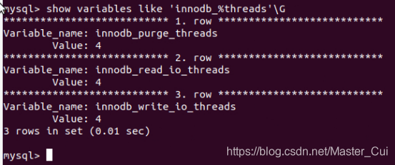 可见当前MySQL实例的IO线程有一个insert buffer线程,一个log线程,4个读线程,4个写线程