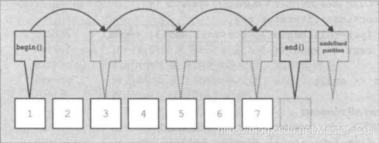 使用随机访问迭代器时,需要注意不能让迭代器的位置超过end(),因为随机访问迭代器提供了前进n个元素的操作,所以在使用随机访问迭代器遍历容器的时,循环条件要写成it<container.end(),而不要写成it!=container.end(),因为迭代器作为循环变量有可能一次性前进n个元素,就像下图所示