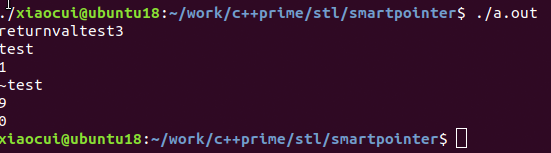 调用函数returnvaltest,然后用make_shared创建一个test对象,调用test的构造函数,并用make_shared的返回值初始化智能指针sp并调用shared_ptr<test> 的拷贝构造函数。此时,test对象的引用计数为1。之后,sp返回时,创建一个shared_ptr<test>的临时对象同时用sp初始化该临时对象,又调用了shared_ptr<test> 的拷贝构造函数并将该临时对象返回,此时test对象的引用计数为2。同时,局部变量sp被销毁,调用shared_ptr<test>的析构函数,引用计数又为1。接着用返回的临时变量初始化主函数中的智能指针sp,调用了sp的拷贝构造函数,此时test对象的引用计数又为2。紧接着临时变量被销毁,test对象的引用计数为1并打印,主函数返回,sp被销毁,调用了sp的析构函数,同时堆上的test对象也被销毁,调用了test的析构函数,程序结束。上述过程较为复杂,只不过shared_ptr的实现没有打印