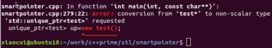 因为用new test()初始化up时,需要将new test()隐式转化为一个unique_ptr<test>对象,需要调用unique_ptr<test>的构造函数,但是unique_ptr<test>的构造函数是explicit,所以转化失败