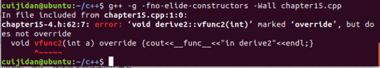 但是,如果给子类的vfunc2函数添加关键字override,则会报错,因为此时此类必须重写父类的虚函数,但是此时形参列表不同
