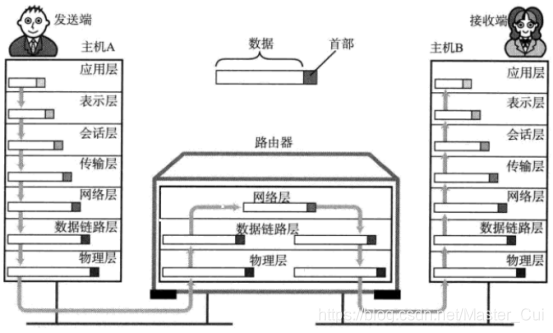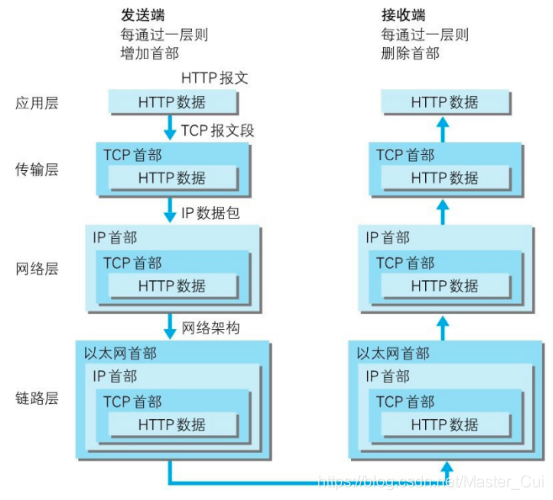 发送端从应用层到物理层从上到下传输数据,接收端的每个分层在接收数据时会添加当前层的首部信息,将首部信息与传输数据一起发出