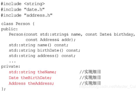 2、Person类和自定义头文件之间形成了编译依赖。任意一个头文件被改变,或这些头文件所依赖的其他头文件有改变,那么每一个含有或使用Person类的文件就得重新编译,连串的编译依赖会导致大量文件被重新编译,增加编译的时间