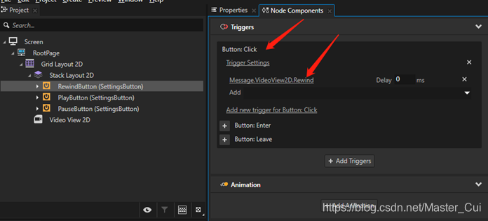 工程窗口的主要就是三个button,每个button设置一个buttonclick的动作,比如,rewind button点击时,会发一个rewind的消息,从而触发对应的消息处理函数,在消息处理函数中,最终会调用video_util类中的play,pause等动作