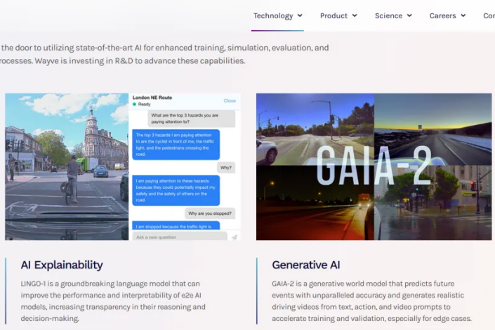 Wayve的“解说型”驾驶:这家英国公司的LINGO-2模型能边开车边“讲解”,遇到行人减速时会说“因为行人过马路,正在避让”,目前已经和Uber合作测试Robotaxi,计划2027年装到量产车上。