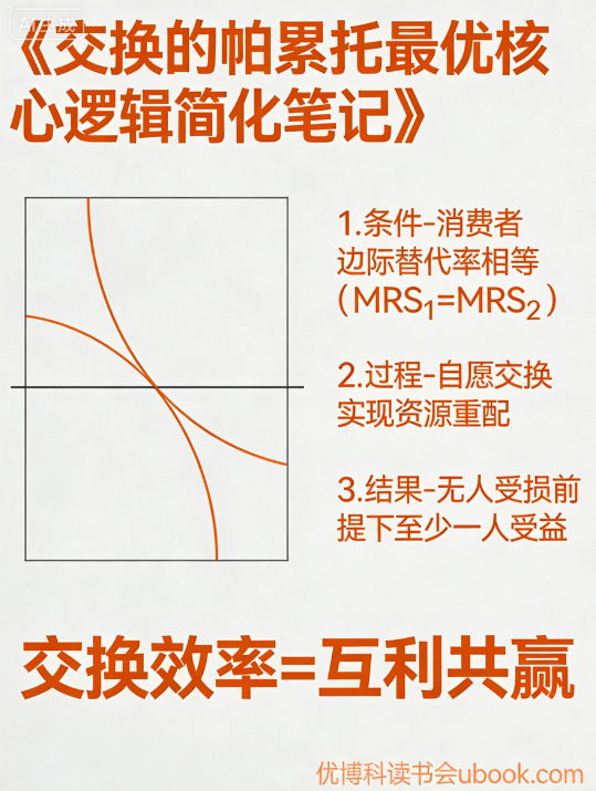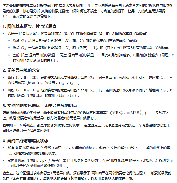 交换的帕累托最优:聚焦“两种商品在两个消费者之间的分配”,核心是“商品交换的最优终点”——此时再换商品,必然有人受益、有人受损。