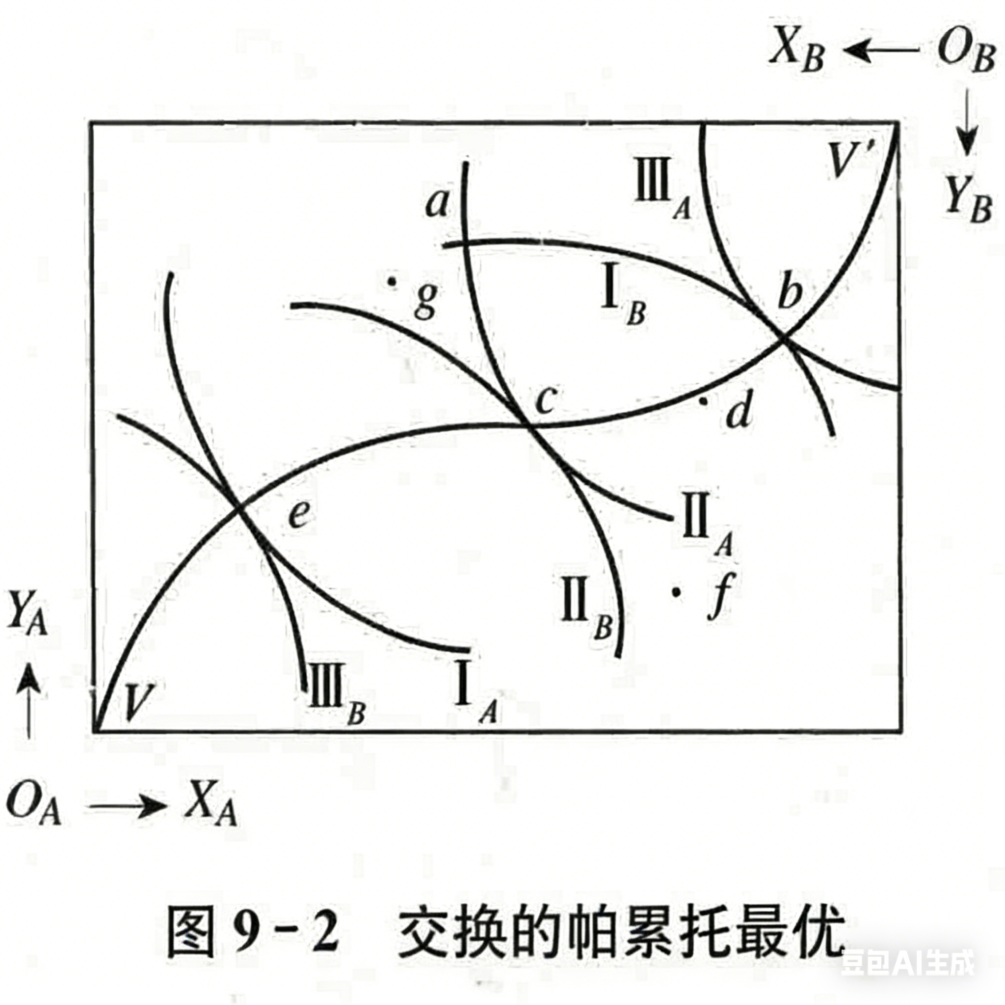埃奇沃思盒中,A的无差异曲线与B的无差异曲线的切点,就是交换的帕累托最优状态。