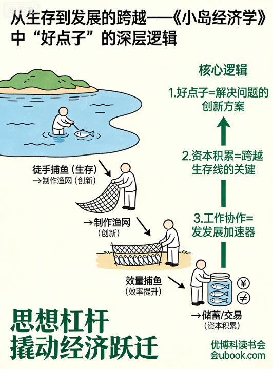 《小岛经济学》用这个简单的故事告诉我们,经济学不是复杂的公式和曲线,而是解决现实问题的工具。艾伯的渔网,就像工业革命中的蒸汽机、信息时代的互联网,本质上都是“解决稀缺问题的好点子”。这些点子的共同特点是:它们都从用户的真实需求出发,用创新的方法提升效率,最终创造出更大的价值。