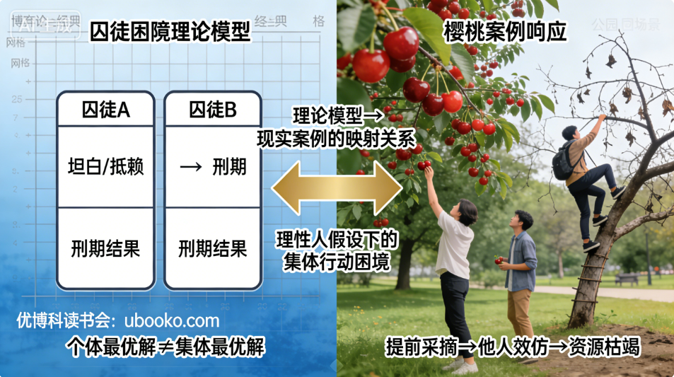 - 樱桃案例的采摘规则(“每人限采 3 斤,免费领取”)、囚徒困境的合作约定(“都不坦白,均判 1 年”),都要让个体一眼就能看懂 “合作有什么好处,背叛有什么代价”。