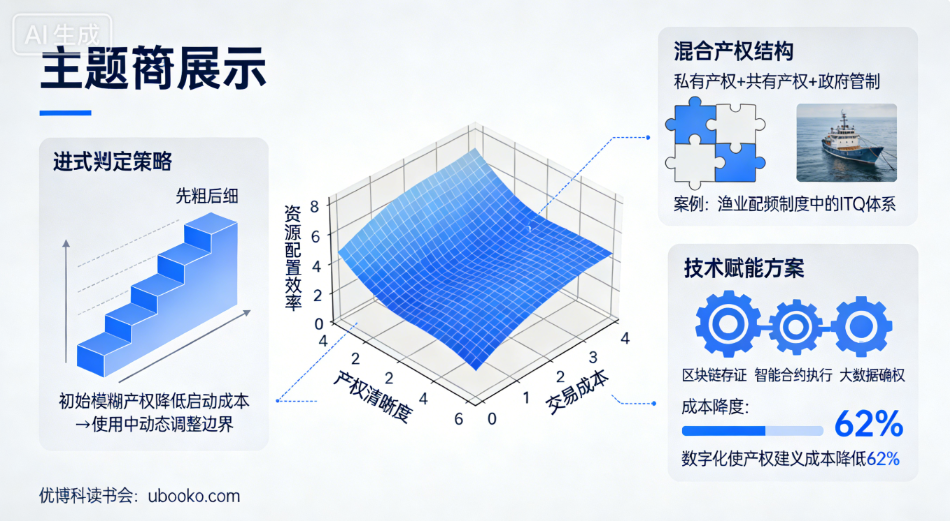 - 收益覆盖成本原则:产权界定与执行的总成本(确权、监督、执法、纠纷解决),必须≤个体收益 + 社会收益(资源利用价值、公共福利、市场流转收益),否则应放弃或简化界定;