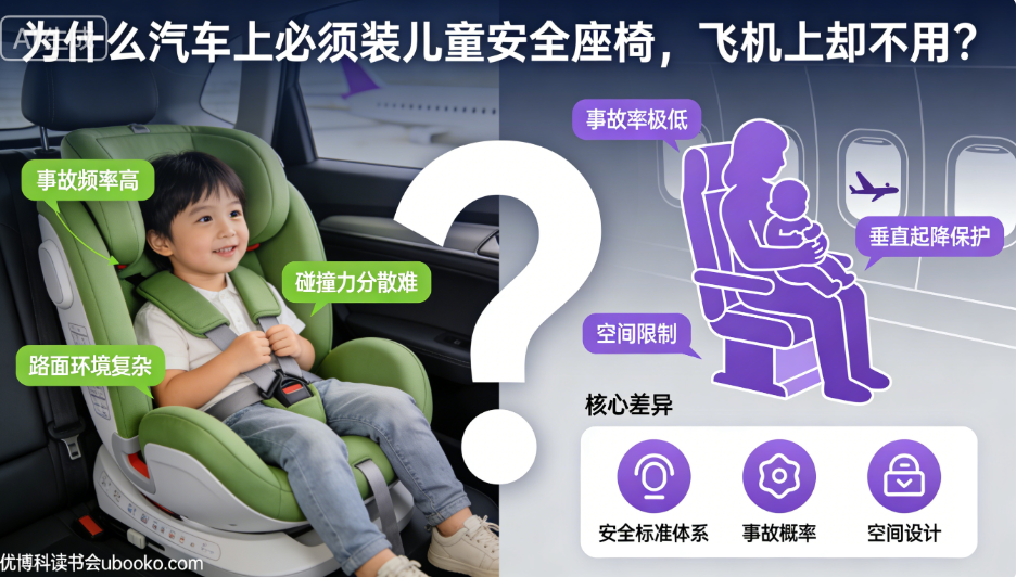 汽车和飞机对儿童安全座椅的不同规定,和 “所有权” 无关,核心是不同交通工具的风险特征、经济成本与安全收益的博弈结果。汽车的高事故率让安全座椅的 “保命价值” 凸显,且成本可控;而飞机的极致安全性,让安全座椅的附加价值被高昂的经济成本抵消。简单来说:汽车上的安全座椅是 “花小钱办大事”,飞机上则是 “花大钱办小事”—— 这就是二者差异的根本原因。