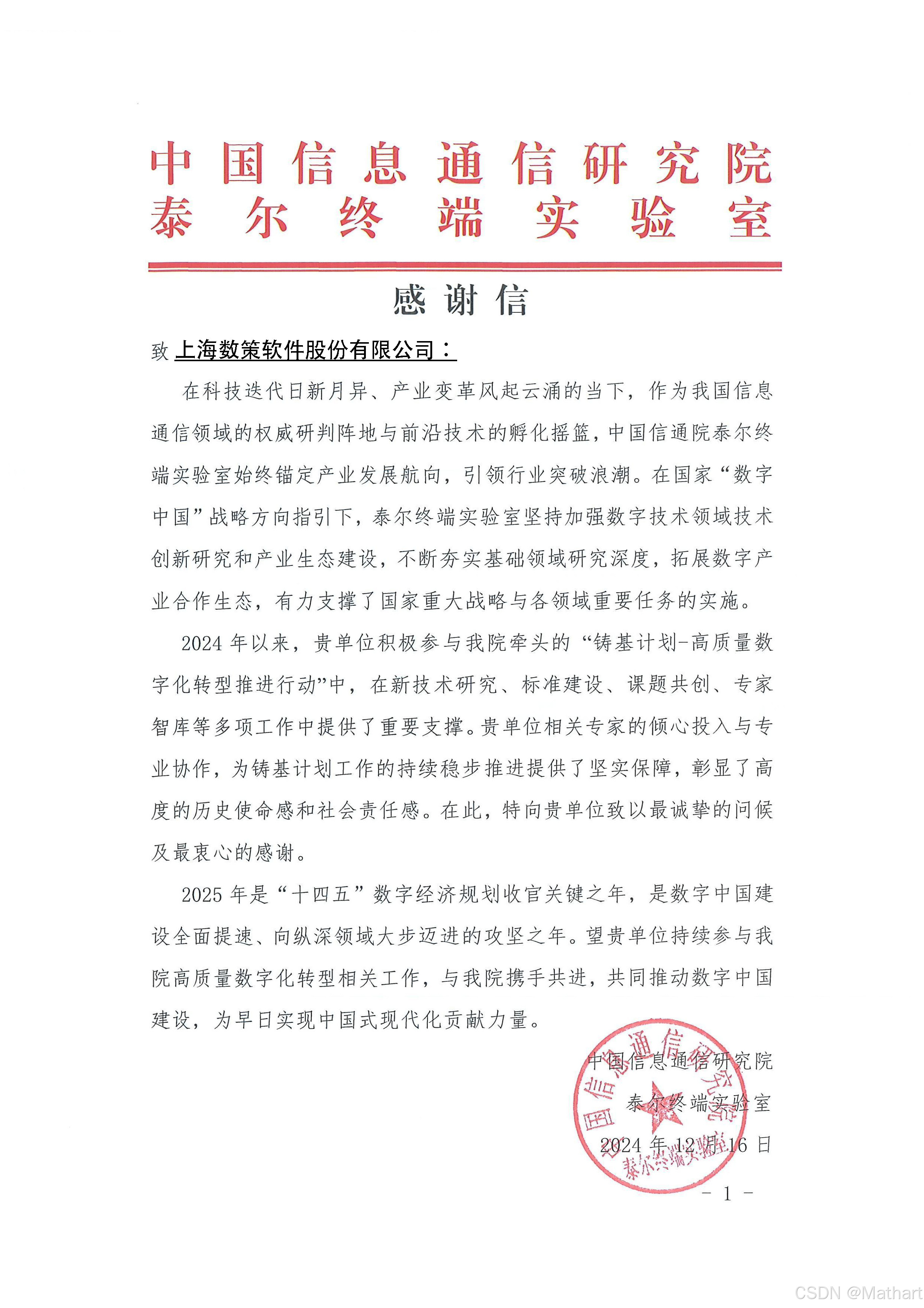 在跨越2024年、迈入充满希望的2025年这一辉煌时刻,中国信息通信研究院铸基计划向上海数策软件股份有限公司致以诚挚的感谢信。信中对数策智能展现的专业实力,以及其IDEAS供应链协同一体化智能决策套件平台在推动制造业发展中所作出的卓越贡献,表达了高度的认可与肯定。