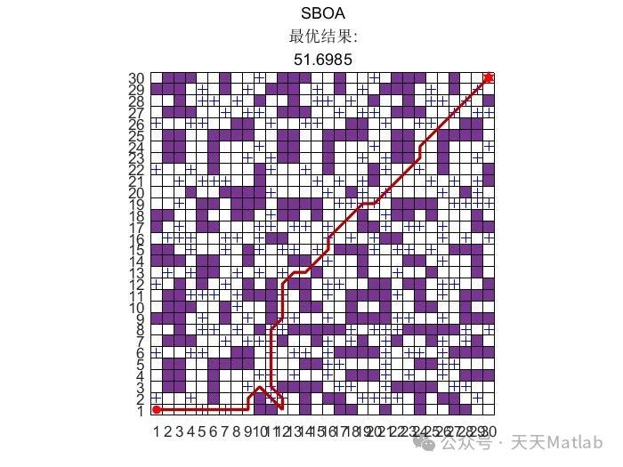 将SBOA算法应用于栅格地图路径规划问题的关键在于将栅格地图中的路径表示为SBOA算法中的个体,并设计合理的适应度函数和位置更新策略。具体步骤如下: