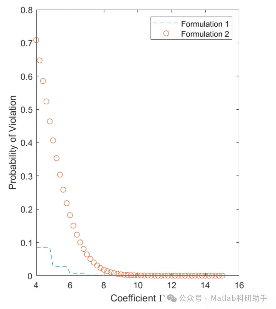 机会约束优化允许约束在一定程度上被违反,但要求约束被满足的概率不低于一个预设的置信水平。其基本思想是将不确定性变量建模为随机变量,并用概率不等式来表示约束条件。例如,对于一个含有不确定性变量 ξξ 的约束 g(x,ξ)≤0g(x,ξ)≤0,可以将其转化为机会约束:
