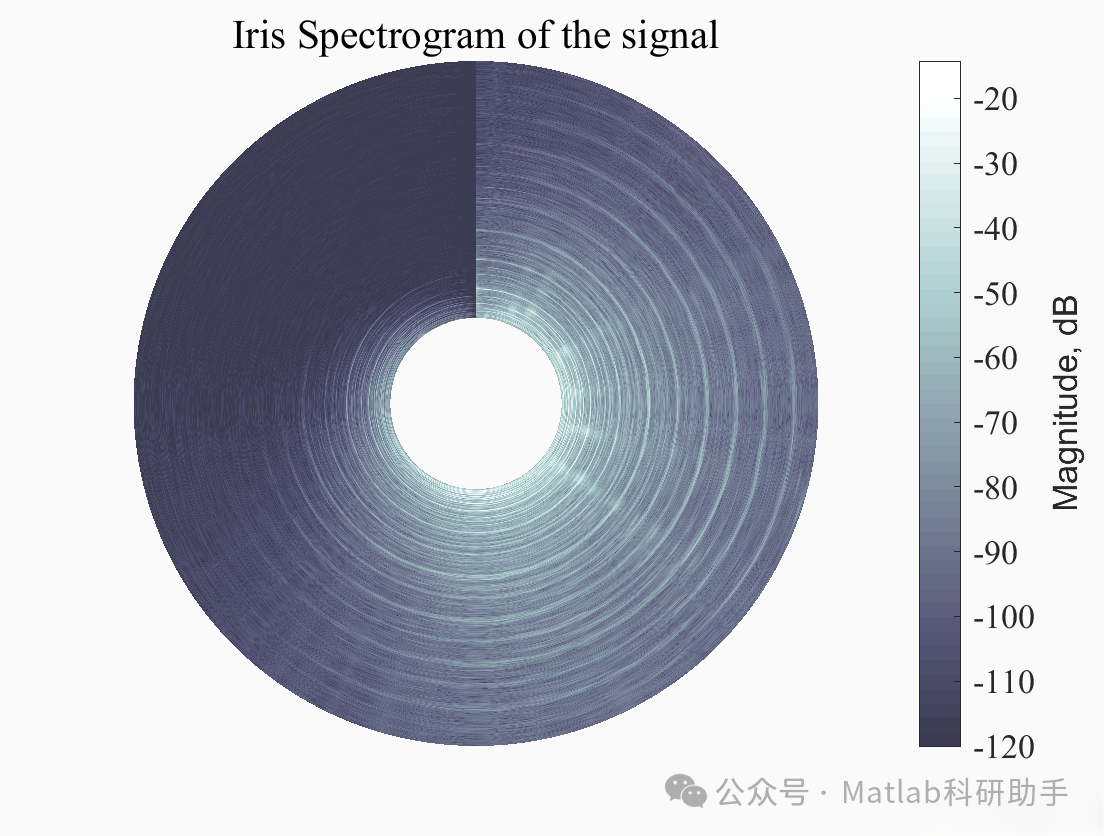 更好的时间-频率聚焦性: 传统时频谱图受到时间-频率分辨率的限制,难以同时获得高时间和高频率分辨率。虹膜图通过巧妙的极坐标映射,能够更好地聚焦信号的时频信息,尤其是在处理瞬态信号和非平稳信号时,能够更清晰地呈现信号的突变和变化。