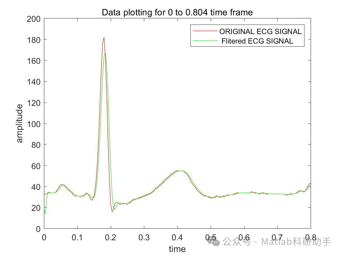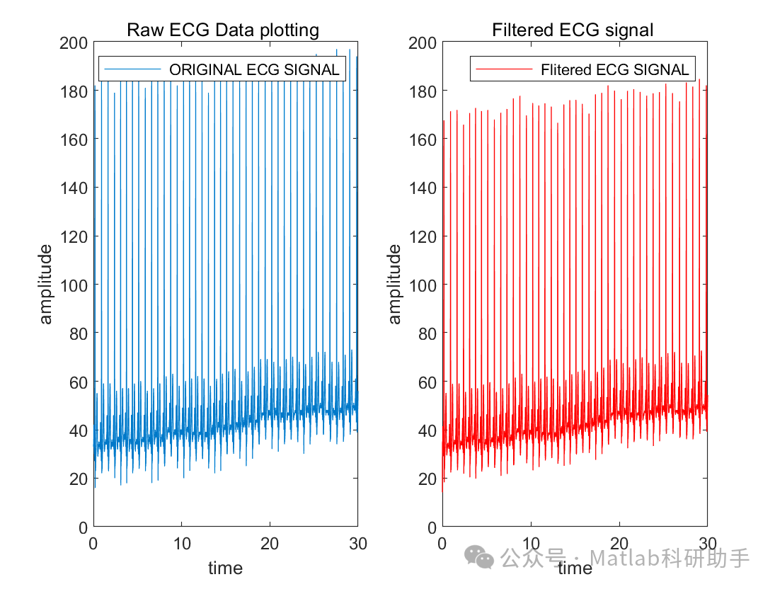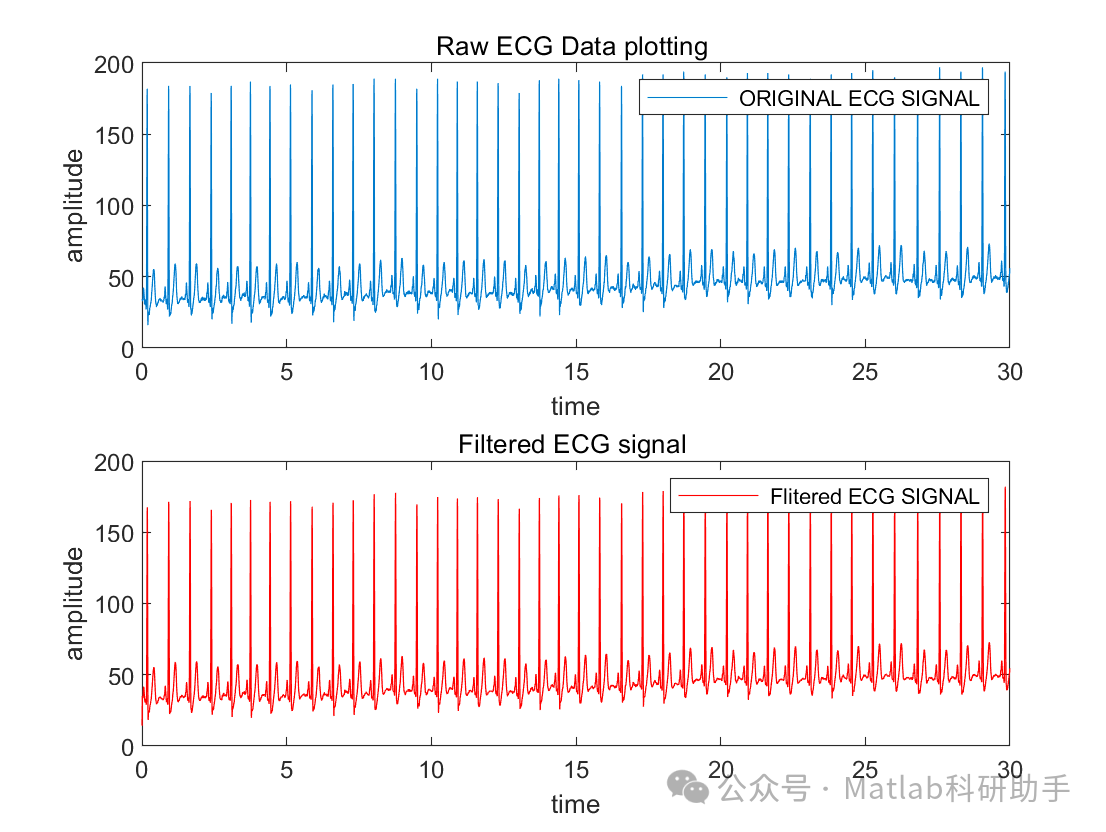 :在时间域内绘制滤波后的ECG信号,以便比较与原始信号的差异,并评估滤波效果。