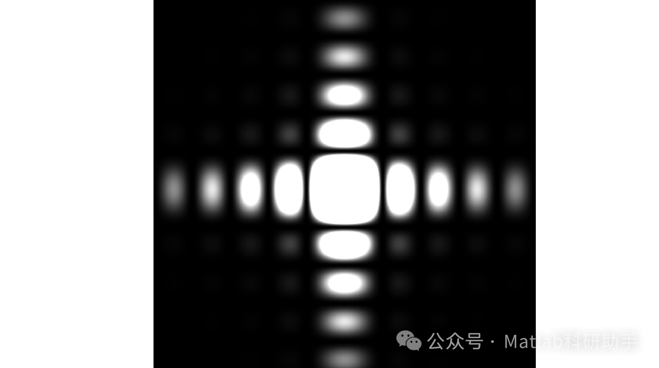 在零点之间,sinc 函数的平方值非零,形成亮度逐渐减弱的旁瓣。这些旁瓣沿着 x′x′ 和 y′y′ 方向延伸,形成一系列交织的亮条纹。