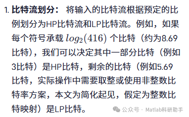 比特到符号的映射是将输入的比特流转换为相应的调制符号的过程。在分层调制中,这个过程需要区分HP比特和LP比特。通常的映射策略是: