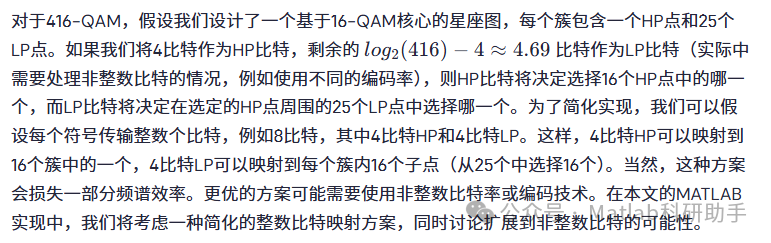 对于416-QAM,由于416不是2的幂次方,我们无法直接使用标准的 2n2n-QAM 星座图。一种可能的思路是将416个星座点分为两个层级。例如,我们可以设计一个包含少数“核心”星座点作为HP层,然后在每个核心点的周围布置一些“辅助”星座点作为LP层。核心点之间的距离较大,保证HP信息的可靠性;辅助点则利用了剩余的星座空间,提升了LP信息的传输速率。