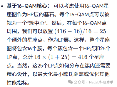 在本文的MATLAB实现中,我们将采用一种基于16-QAM核心的设计思路,并进一步细化每个簇内LP点的分布。具体的星座点坐标将根据优化准则(例如,最小化平均发送功率或最大化最小欧氏距离)来确定。