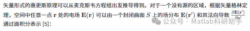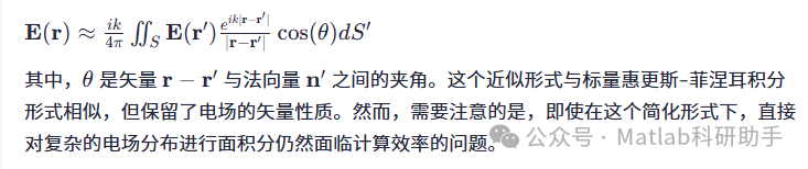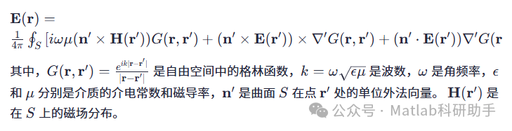 这个积分公式虽然精确,但在实际计算中需要同时知道电场和磁场在曲面上的分布。通常情况下,我们只知道电场或磁场中的一个分量,因此需要进一步简化。在满足边界条件(例如,在理想导体表面电场切向分量为零)或者通过一些近似(例如,基尔霍夫近似),可以将上式简化为仅包含电场或磁场的表达式。