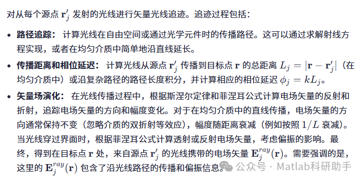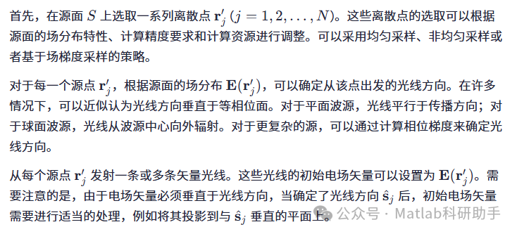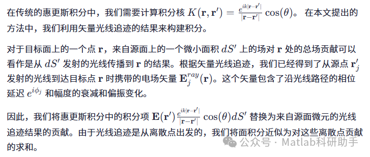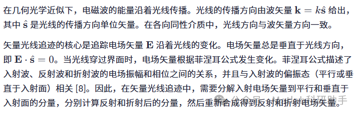 近年来,研究者们一直在探索将几何光学与波动光学相结合的方法。其中一种思路是利用光线追迹来提供积分所需的路径和相位信息 [3, 4]。例如,可以将光线追迹的结果用于构建传播函数,从而简化衍射积分的计算。然而,如何将矢量场的偏振信息有效地纳入到这种结合框架中,以及如何处理非傍轴传播和复杂界面的影响,仍然是需要深入研究的问题。
