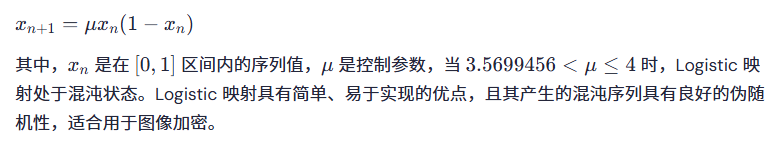 常用的混沌映射包括Logistic映射、Lorenz系统、Chen系统等。本文主要考虑使用一维Logistic映射作为混沌序列的生成器,其数学表达式如下: