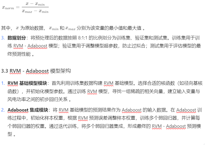 随着 “双碳” 目标的推进,风电在能源领域的地位愈发重要。但风电功率的不稳定特性使得电力系统在发电计划安排、调峰调频以及电力市场交易等方面面临诸多难题 。传统的风电功率预测方法,如物理方法依赖精确的气象数据和风机参数,计算复杂且适应性较差;统计方法在处理非线性、非平稳的风电数据时,预测精度难以满足实际需求 。机器学习算法为风电功率预测提供了新的思路,其中相关向量机(RVM)以其稀疏性和良好的泛化能力,在回归问题中展现出独特优势;Adaboost 算法通过不断调整样本权重,迭代训练多个弱学习器,能够有效提升模型的预测性能 。将 RVM 与 Adaboost 相结合应用于风电功率多变量输入单步预测,有望充分发挥两者的优势,为风电功率预测提供更有效的解决方案。