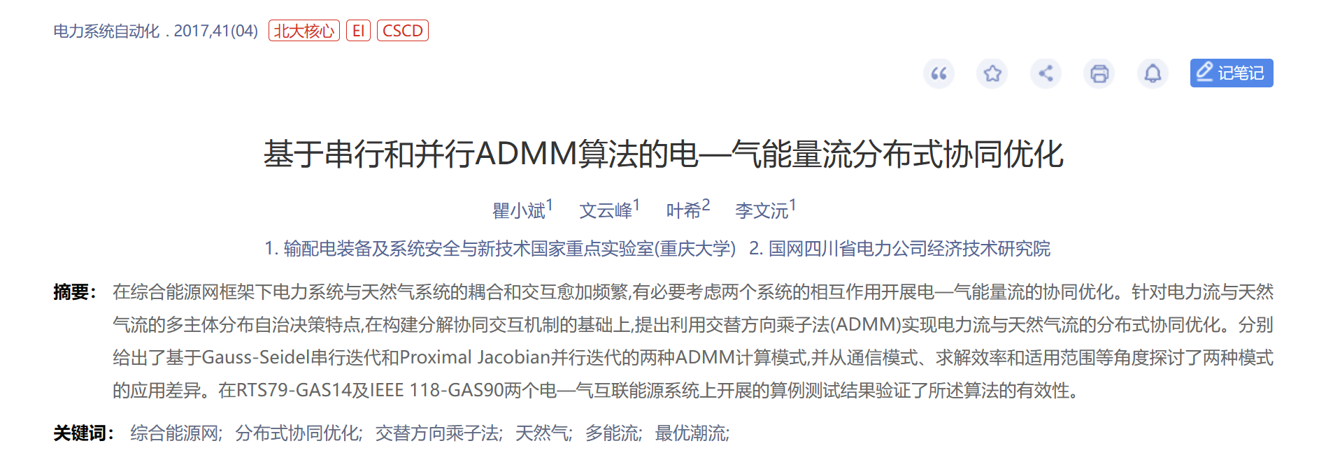 [1]瞿小斌,文云峰,叶希等.基于串行和并行ADMM算法的电—气能量流分布式协同优化[J].电力系统自动化,2017,41(04):12-19.