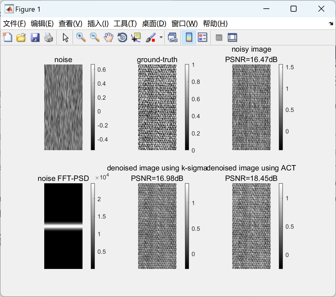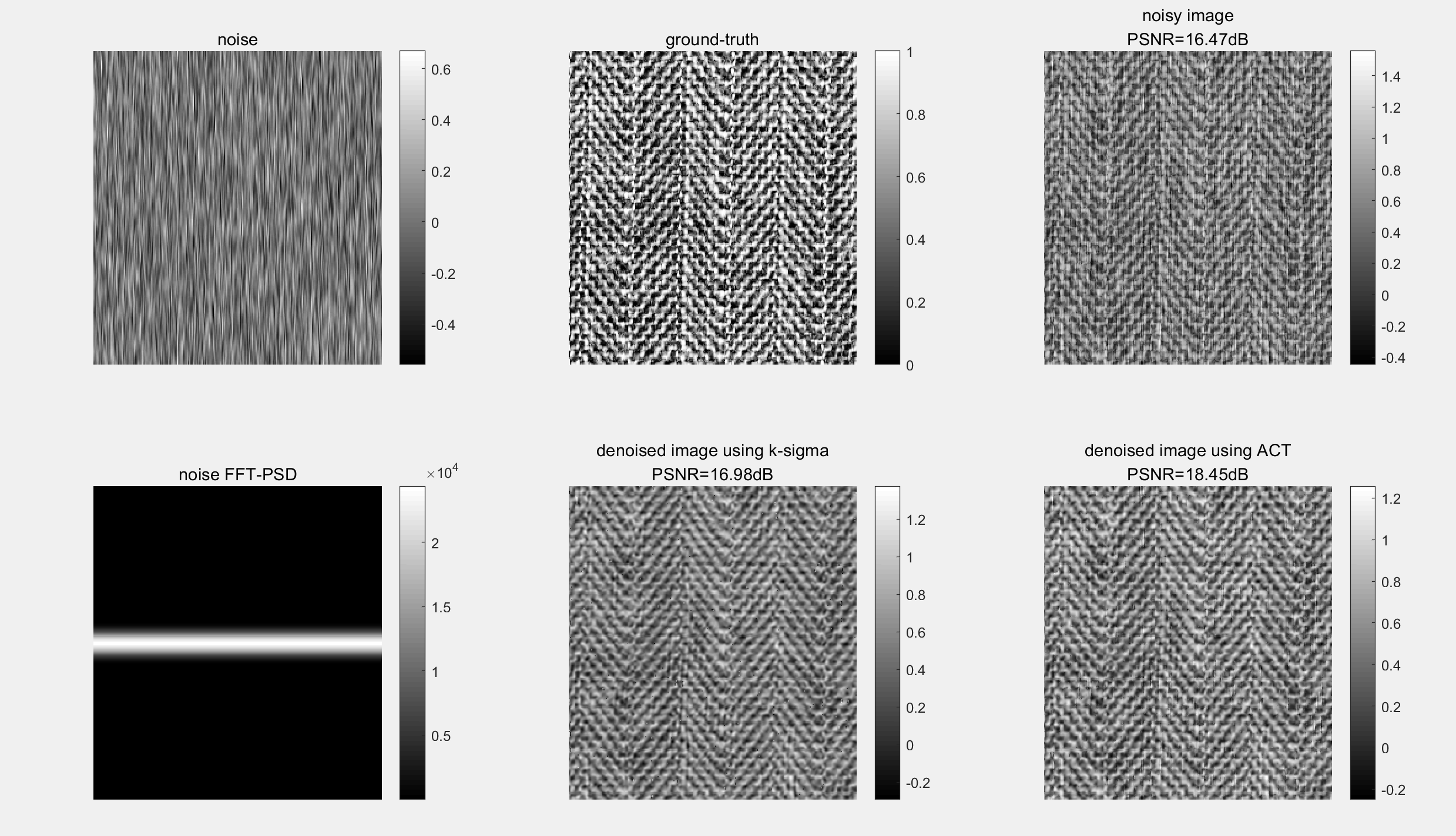 colorbar, axis off, title(sprintf('denoised image using ACT\nPSNR=%0.2fdB',psnr_act))